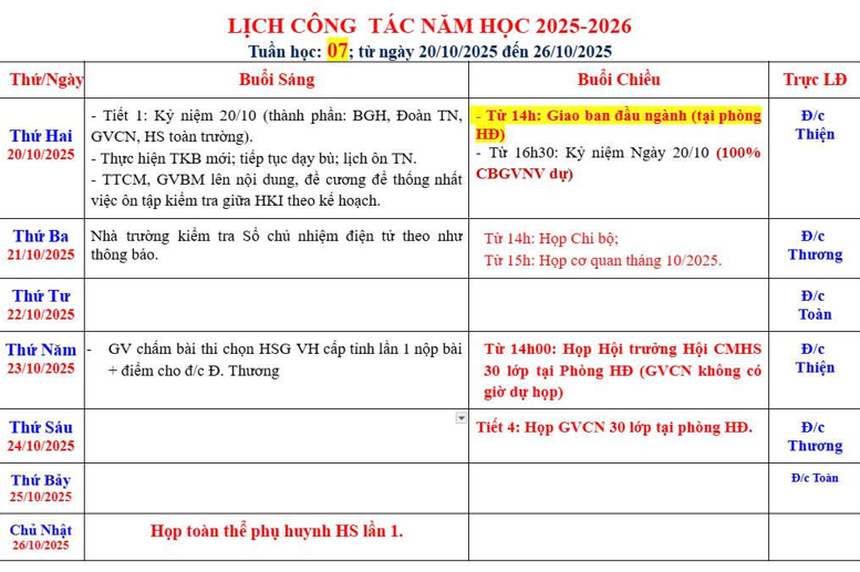 Bộ phận chuyên môn báo khó bố trí học 2 tiết chiều thứ 2, do đó nhà trường sẽ linh hoạt duy trì vào-ra các tiết học bằng hiệu lệnh trống để sớm tổ chức Kỷ niệm 20/10. Tuần học có nhiều nội dung quan trọng, CBGVNV lưu ý thực hiện
