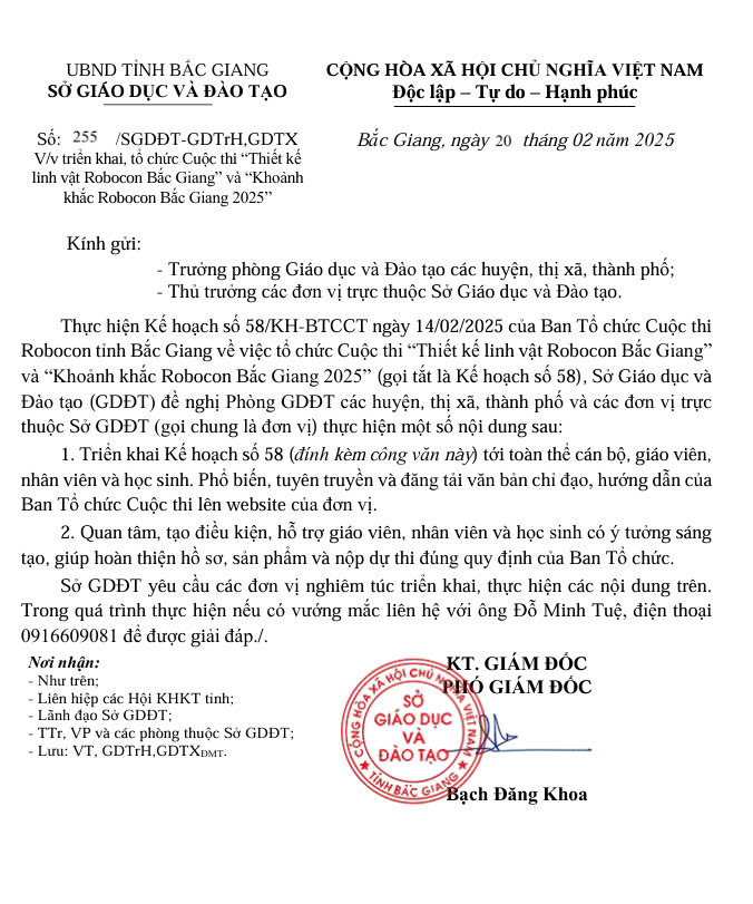 Thực hiện kế hoạch số 163/KH-UBND ngày 25/10/2024 của Chủ tịch UBND tỉnh về việc Tổ chức Cuộc thi Robocon tỉnh Bắc Giang lần thứ 2, năm 2025; nhằm lan tỏa mục đích, ý nghĩa của Cuộc thi Robocon tỉnh Bắc Giang đến rộng rãi cộng đồng xã hội, Ban Tổ chức Cuộc thi Robocon tỉnh Bắc Giang (BTC Cuộc thi) xây dựng kế hoạch tổ chức cuộc thi " Thiết kế linh vật Robocon Bắc Giang” và Khoảnh khắc Robocon Bắc Giang 2025” (Nội dung trong file đính kèm):